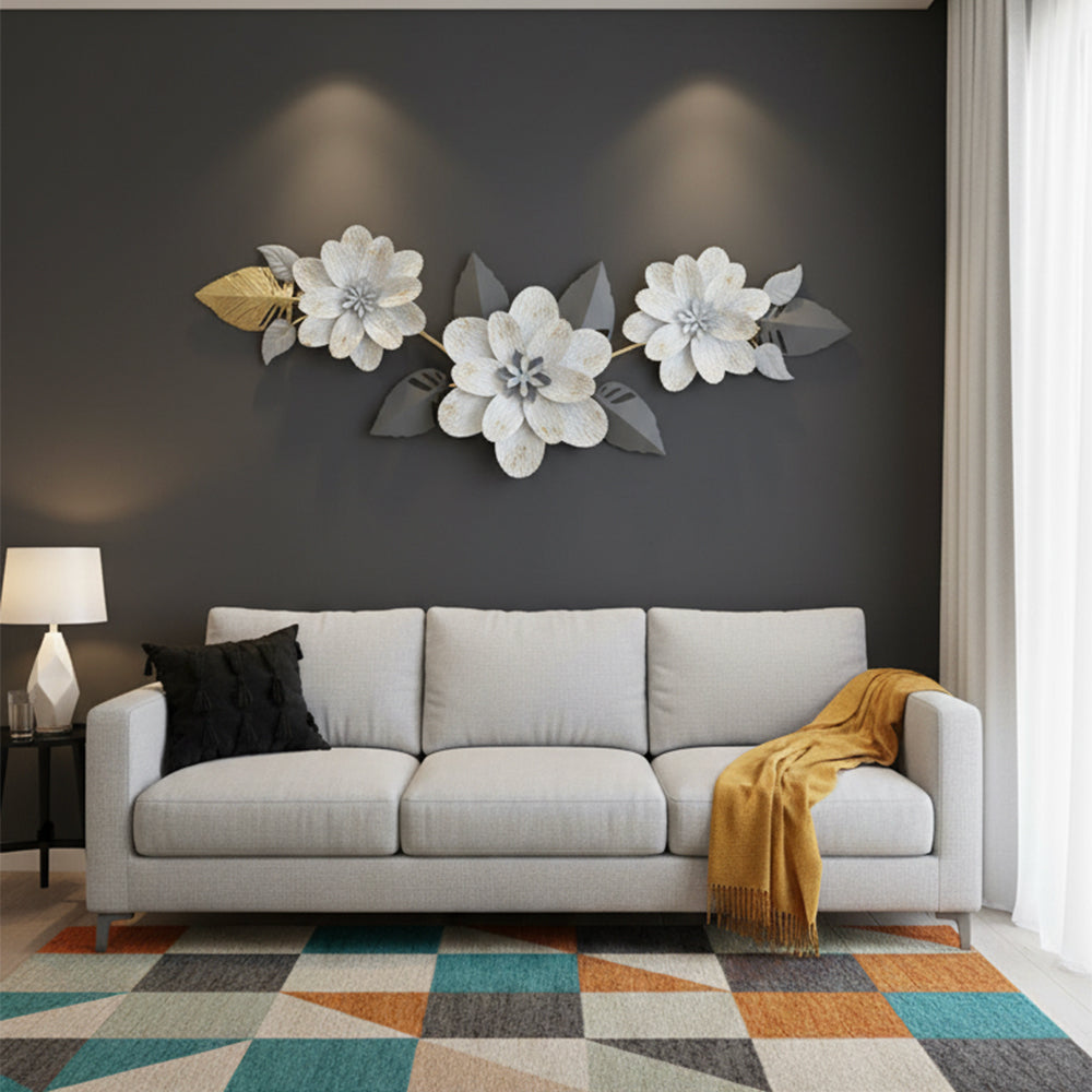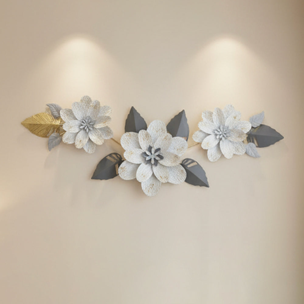 The image features a white and gold flower decoration displayed on a wall. This decorative piece adds an elegant touch...