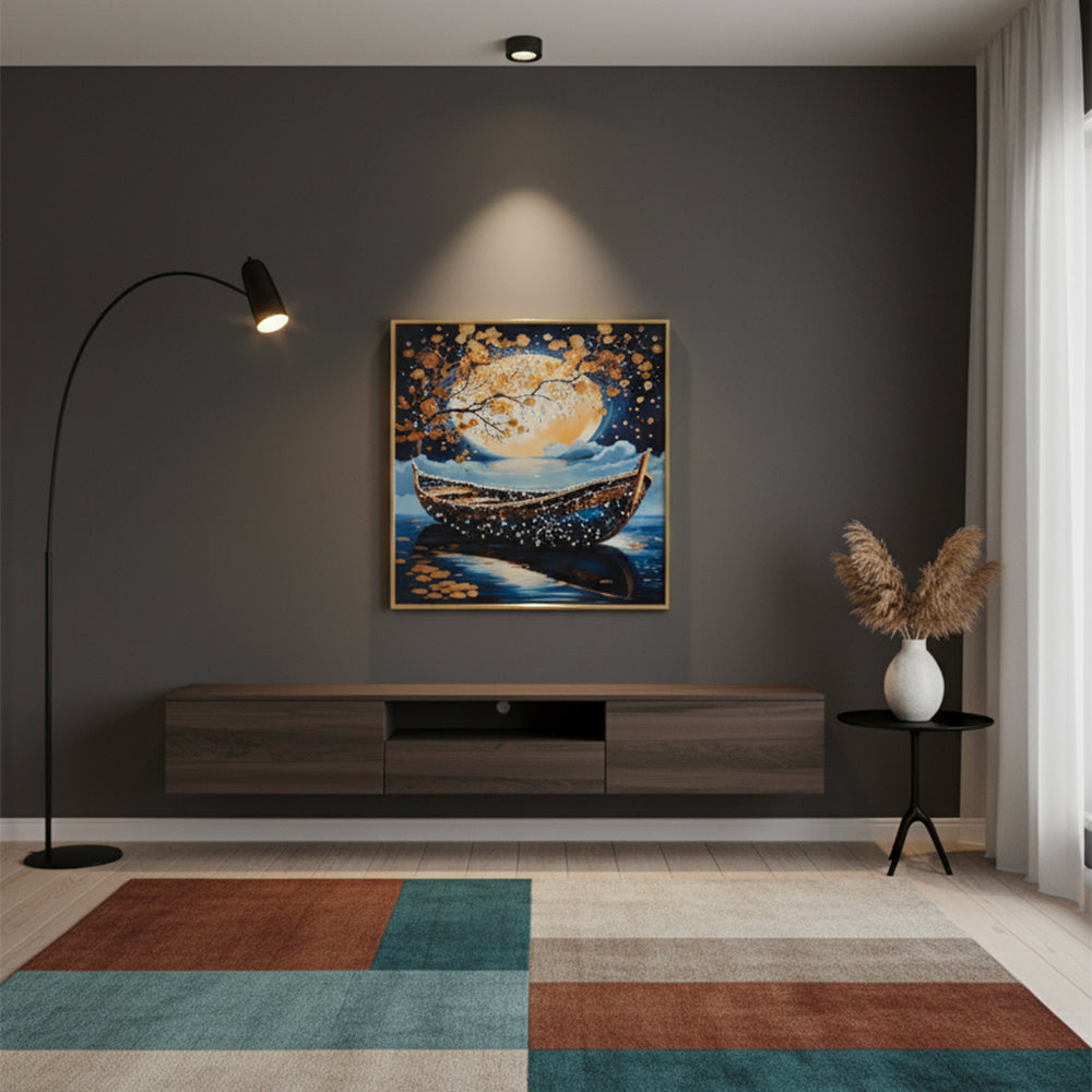 Bring serene elegance into your space with this epoxy resin artwork, showcasing a moonlit boat and shimmering crystal details. Perfect...