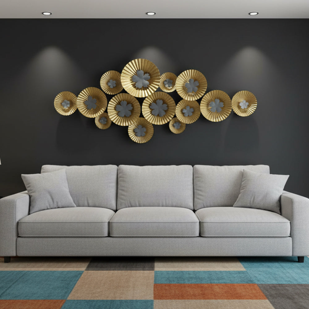 The image features a wall adorned with intricate gold flowers, creating a luxurious and artistic display. This indoor setting showcases...