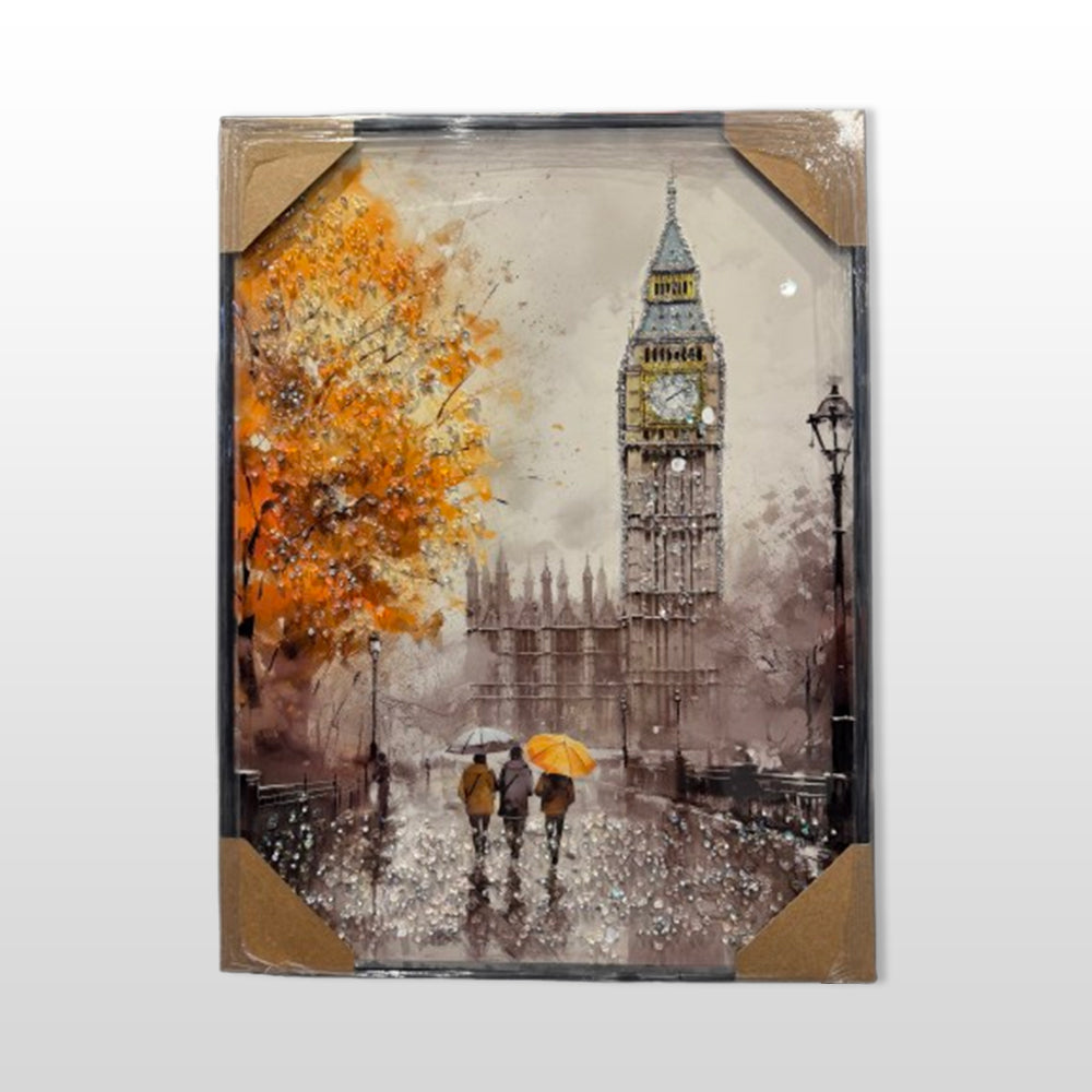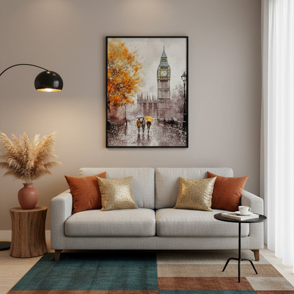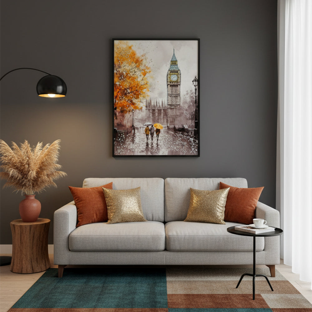 A captivating artwork portraying London’s iconic landmark under a gentle rain, blending reflective streets and soft light to evoke romance,...