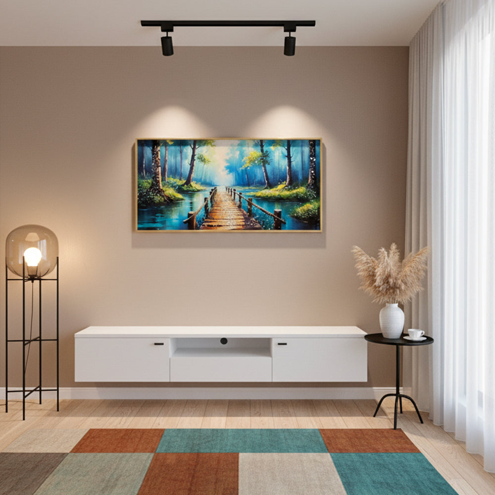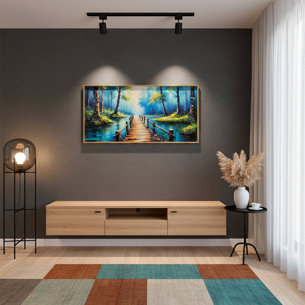 A peaceful artwork depicting a calm pathway or bridge over serene waters, evoking reflection, harmony, and a sense of quiet...